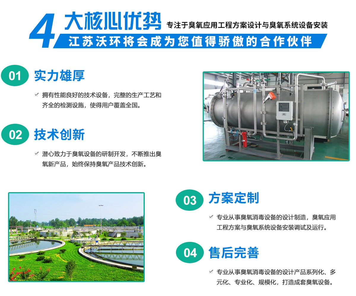 江蘇沃環環保科技有限公司技術力量雄厚,擁有一批高素質的科研技術人員;公司技術研發中心不斷研發 先進的臭氧產生與應用技術,為公司的發展奠定了堅實的基礎;公司擁有中高頻臭氧電源技術、臭氧電極雙冷 放電技術、高濃度臭氧產生與控制技術、廢水、廢氣臭氧處理技術、高濃度臭氧水混合與應用技術、HVAC空間 殺菌技術、制藥GMP空間處理、食品QS車間處理等多項科研技術成果